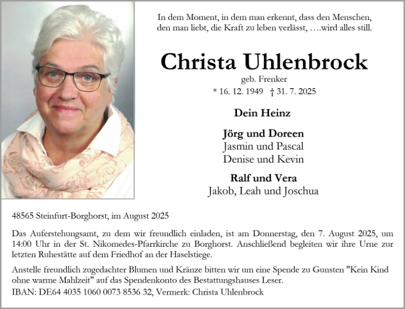 zum Tod von Christa möchte ich Euch mein herzliches Beileid und tiefstes Mitgefühl aussprechen.Ich wünsche Euch viel Kraft in dieser schweren Zeit.
