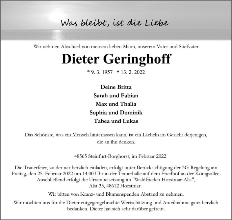 Wir trauern um Dieter und denken an Britta und den Kindern. Wünschen euch viel Kraft und denkt nur an die guten Zeiten. Lg Jutta und Günter