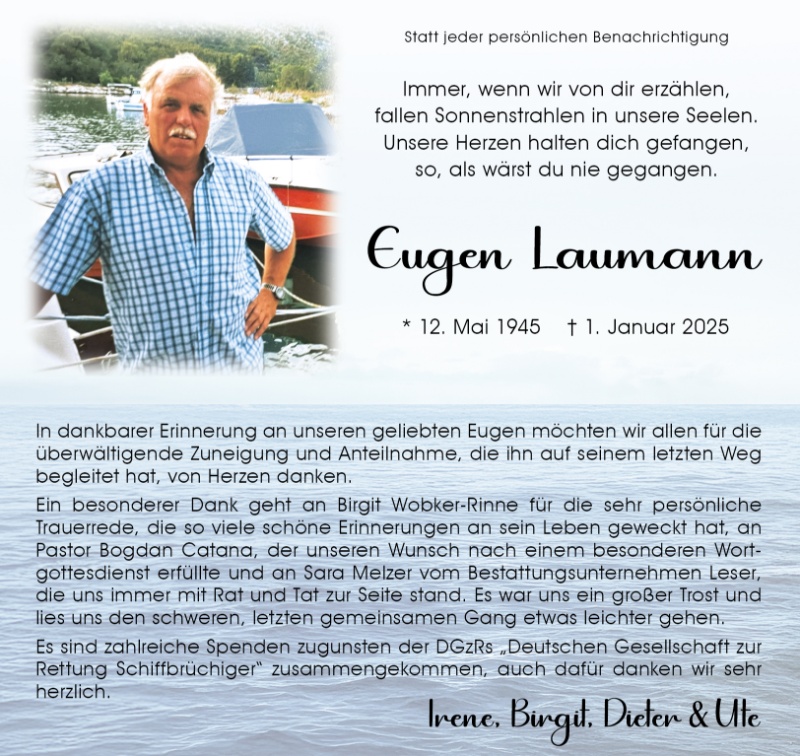 Zum Tode von Eugen spreche ich Dir und Deinen Kindern mein aufrichtiges Beileid aus. Gerne denke ich zurück an die schöne Zeit bei Euch in der Tennishalle. Es waren doch unsere schönsten Jahre.