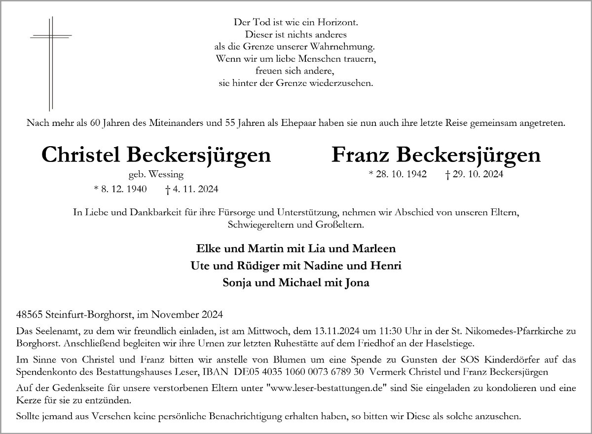 Zum Tode Eurer Eltern wollen wir euch hiermit unser Beileid aussprechen. In so kurzer Zeit beide Eltern zu verlieren, ist ein enormer Verlust für das gesamte Familienleben. Ein schwacher Trost ist es , dass beide im Tod wieder vereint sind. Wir wünschen euch allen viel Kraft !