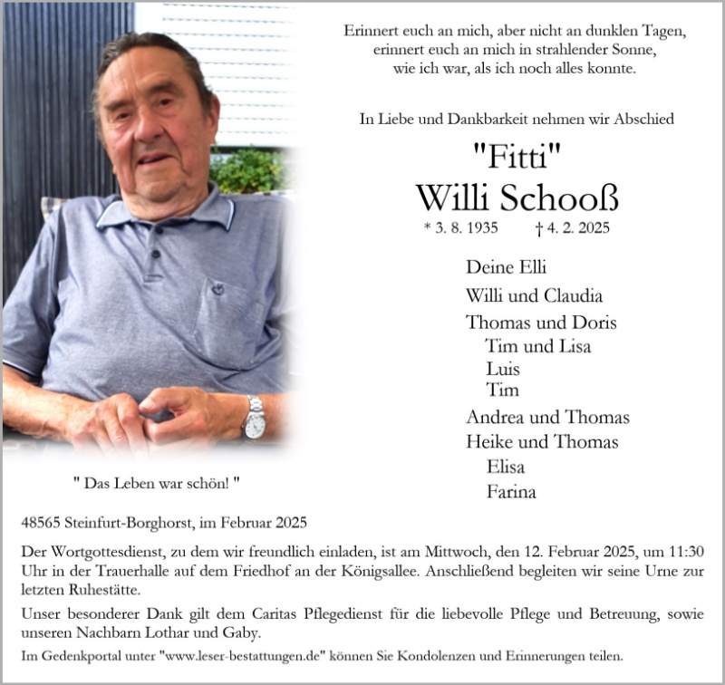 Ich kannte Onkel Willi als einen offenen, fröhlichen, freundlichen und gastfreundlichen Mann. Ich bin froh, dass ich ihn kürzlich besucht habe. Der Familie und den Freunden viel Kraft angesichts dieses schweren Verlustes.
