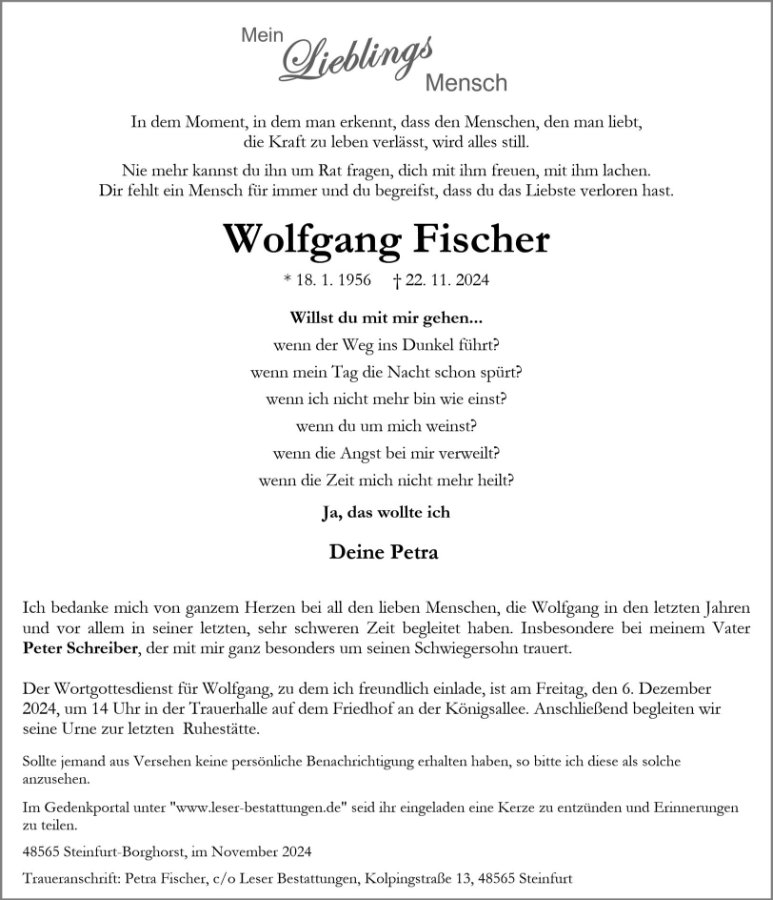 Liebe Petra und lieber Peter,ich möchte Euch zum viel zu frühen Tod von Wolfgang mein herzliches Beileid aussprechen und ganz viel Kraft wünschen in dieser schweren Zeit.